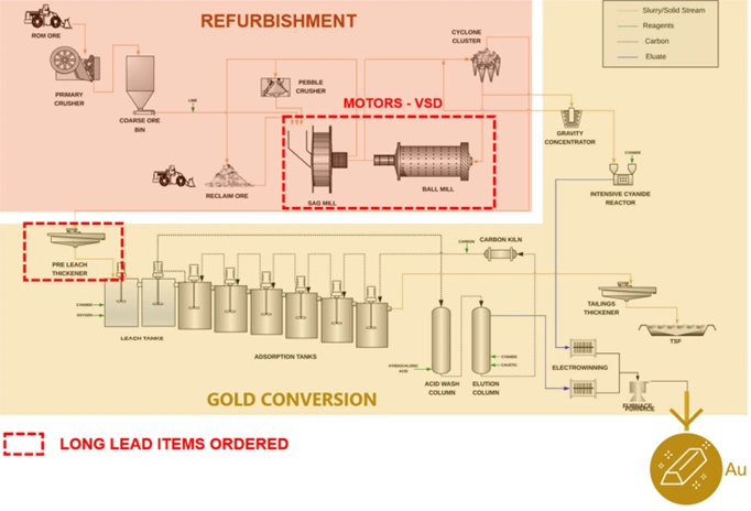 Figure 2: Block flow diagram of the Black Swan Processing Hub highlighting long lead items ordered for the gold conversion process. [Horizon Minerals]