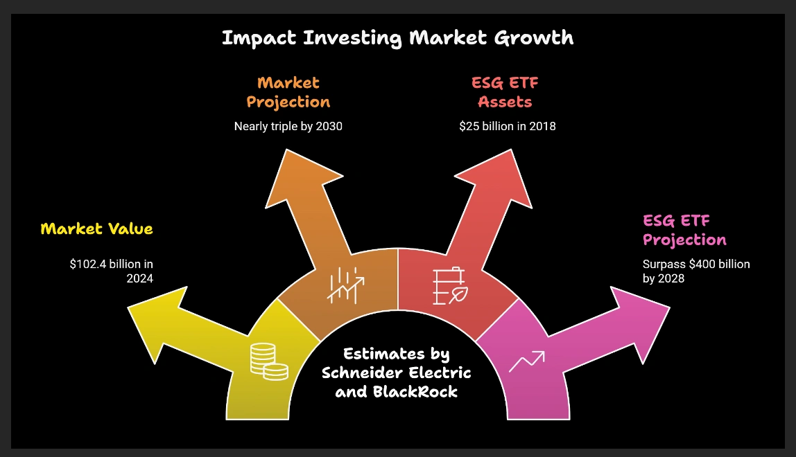 The figures tell a compelling story. The global impact investing market was valued at $102.4 billion in 2024, with projections suggesting it could nearly triple by 2030, according to analysis by Schneider Electric. ESG ETF assets, which were worth approximately $25 billion in 2018, were forecast by BlackRock to surpass $400 billion by 2028. Whether or not that target is met exactly, the trajectory is unmistakable.