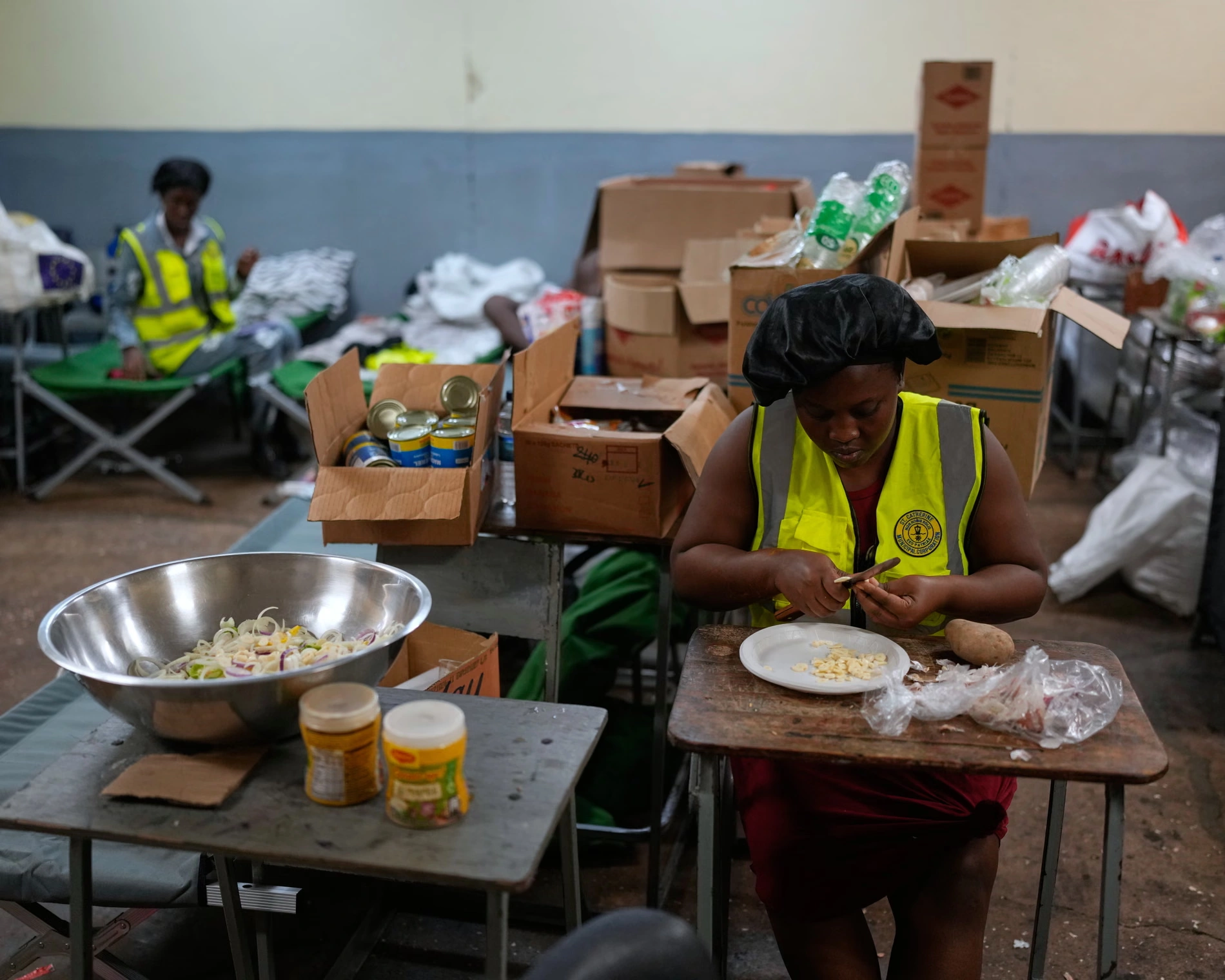 Cooks prepare meals at a shelter set up in a school in Old Harbour, Jamaica