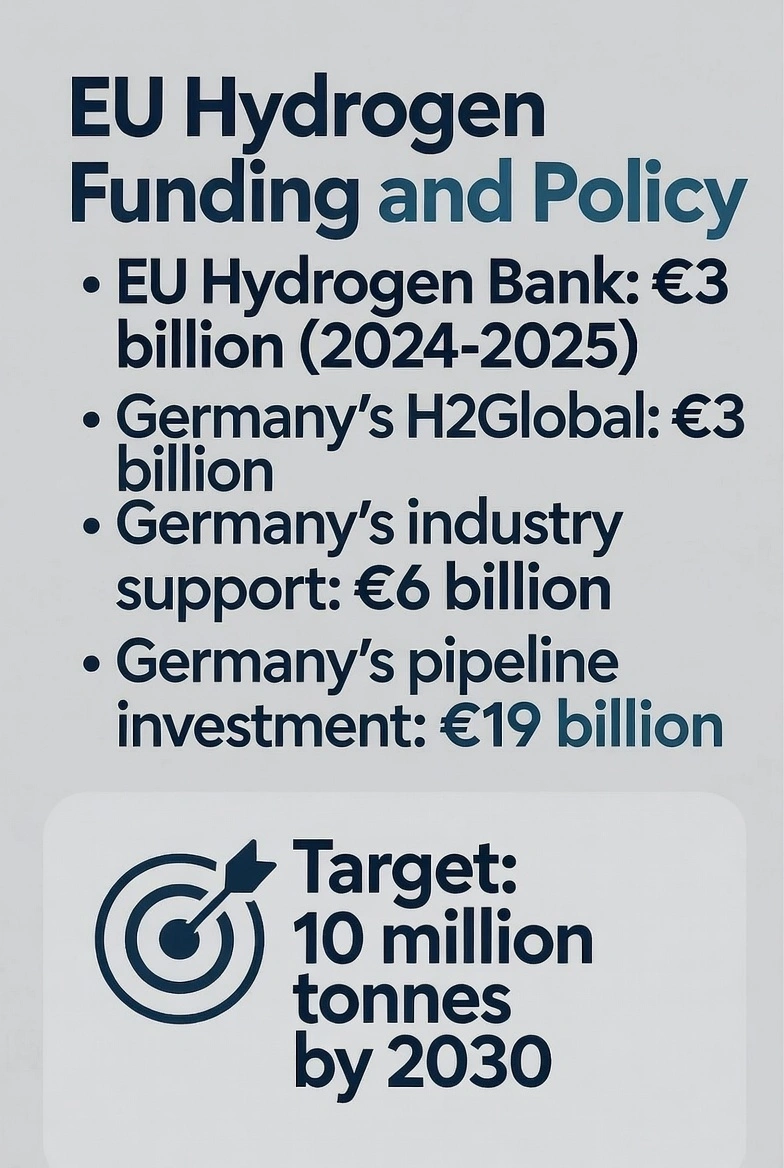 The EU Hydrogen Strategy targets 10 million tonnes of renewable hydrogen production and import by 2030, prioritizing industry, mobility, and energy storage. Subsidies and quotas under REDIII encourage electrolysis-based production to help cut emissions by 55% by 2030. Germany is investing €19 billion in a 9,000 km hydrogen pipeline network set for completion between 2028 and 2032.