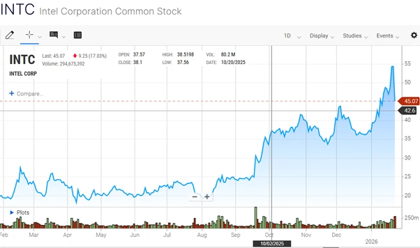 Figure 5: One-year share price chart of Intel Corporation, showing the sharp decline to US$45.07 per share on 24 January 2026. [Nasdaq]