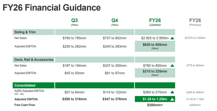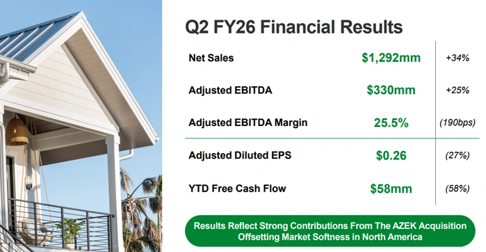 During Q2 FY26, the Siding & Trim division delivered approximately USD 947 million in revenue. Adjusted EBITDA for this segment reached USD 241 million with a margin of 25.4%. The Deck, Rail & Accessories segment contributed USD 256 million in net sales. This segment achieved Adjusted EBITDA of USD 79 million with a margin of approximately 31%.