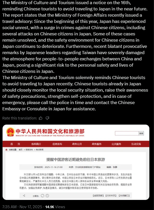 China’s warning to its citizens highlights risks to people-to-people ties between the countries. Earlier this year, China had repeatedly advised its citizens to exercise caution in Japan. The latest advisory is stronger, urging avoidance of travel altogether. This could further damage relations at the grassroots level and reduce cultural and commercial exchanges.