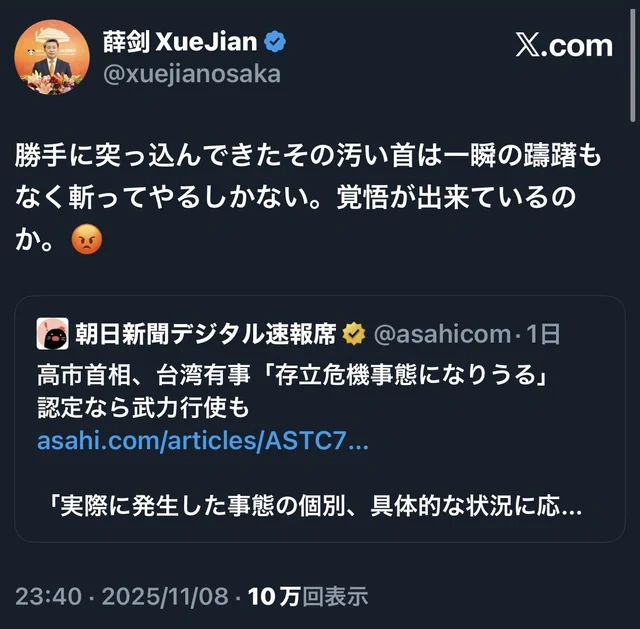 China’s consul general in Osaka made a viral social media post threatening Japan. The post said, “We have no choice but to cut off that dirty neck that has been lunged at us.” Japan promptly issued a diplomatic protest against the aggressive language. The Chinese post was later removed, but the back-and-forth continued throughout the week.