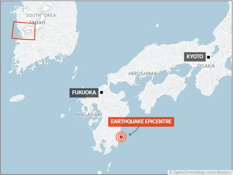 The earthquake struck at 9:19 pm local time, about 18 kilometres off Kyushu’s coast. Initially recorded as a 6.9-magnitude event, it was later revised to 6.6. According to the JMA, the quake did not meet the criteria to trigger special warnings for the Nankai Trough.