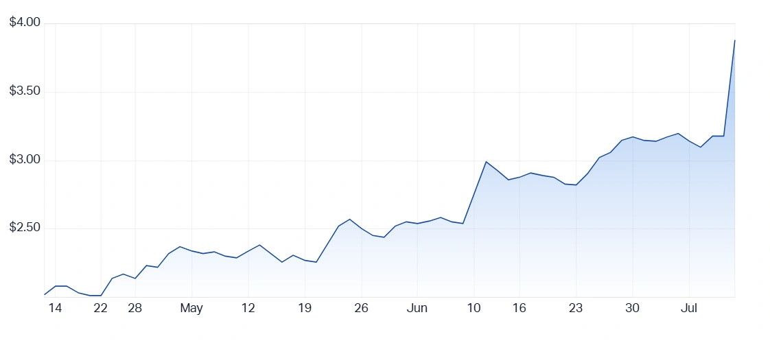 Figure 1: Stock price performance of Johns Lyng Group in the last 3 months, with a significant increase today, July 11th, 2025. [Market Index]