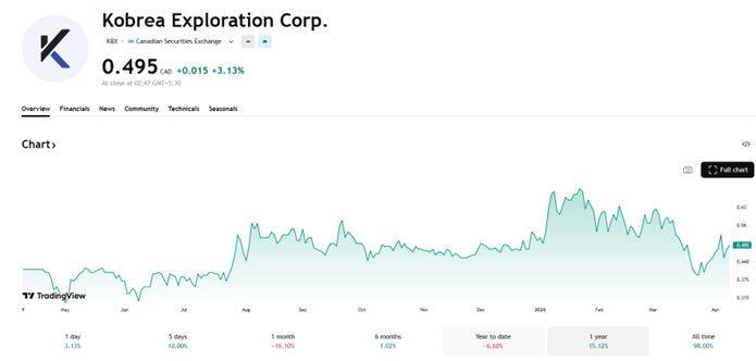 Figure 4: Kobrea Exploration Corp. (CSE: KBX) one-year share price chart [Courtesy: TradingView]