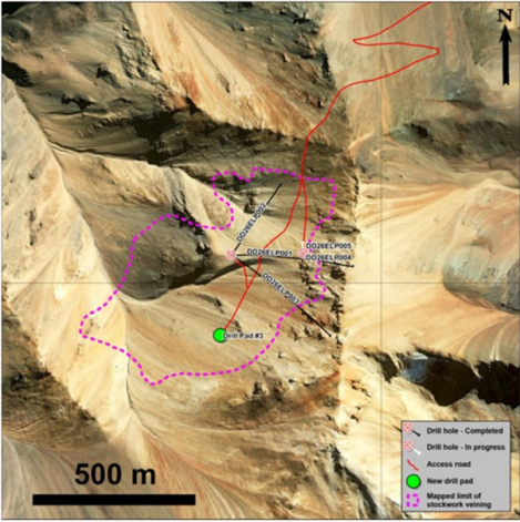The fifth hole is designed to complete the original objective of drill hole DD26ELP004, which was to extend a mineralised zone encountered in DD26ELP001 to depth. That zone comprised strong pyrite-chalcopyrite-molybdenite stockwork veining within potassically altered early mineral quartz diorite porphyry.