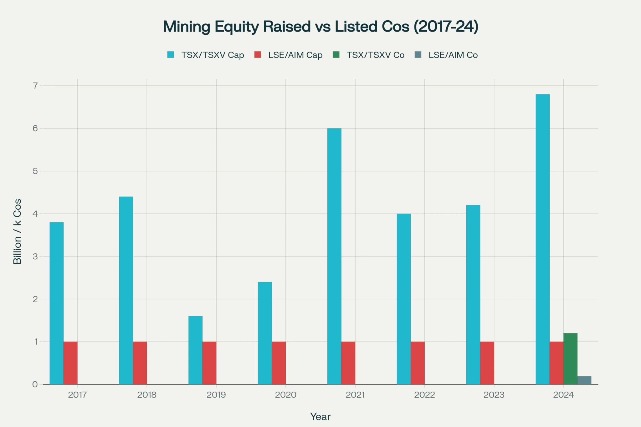 Mining capital raised and listings: TSX/TSXV vs LSE/AIM (2017–2024).
