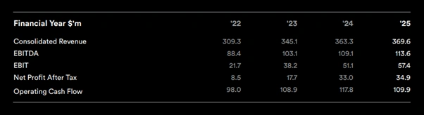 Macquarie Technology delivered its eleventh consecutive year of EBITDA growth in FY25, with EBITDA increasing 4.1% to AUD 113.6 million on revenue of AUD 369.6 million.
