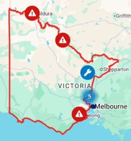 Outage map and workers repairing local electricity lines. [powercor.com.au]