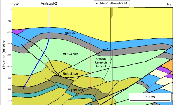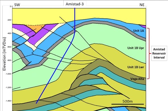 Amistad-3 geological cross-section showing extended reservoir intercept potential