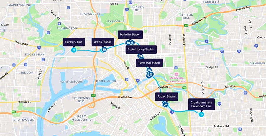 - Parkville Station – serving Royal Melbourne Hospital, Royal Women’s Hospital, and Peter MacCallum Cancer Centre