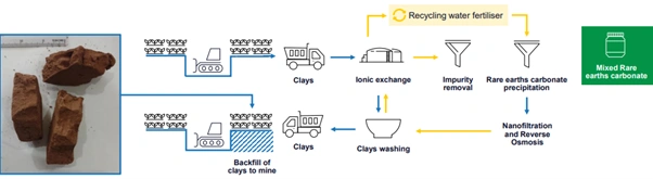 The company utilises a flowsheet to extract minerals from ionic clays. This process avoids steps like drill and blast or tailing dams. The team washes the clays and uses ionic exchange to collect the rare earths.
