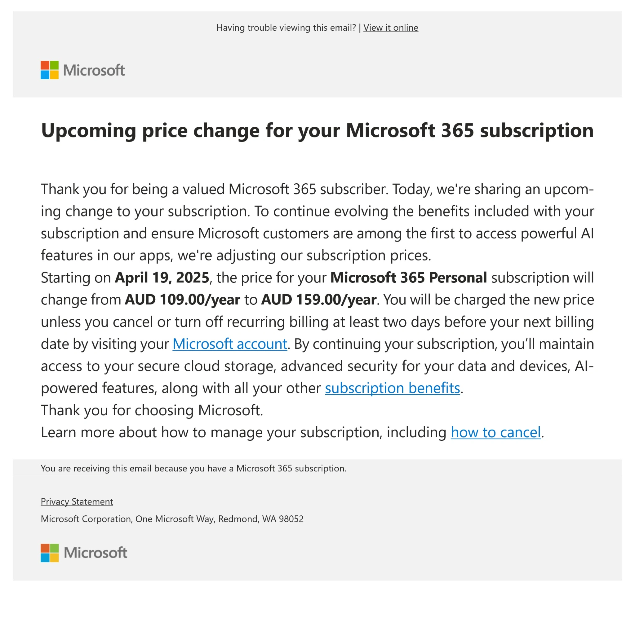Annual subscription costs for the Microsoft 365 Personal plan increased by 45 percent from $109 to $159. The Family plan rose 29 percent from $139 to $179. Around April 2025, these price hikes began taking effect as users reached their renewal periods.