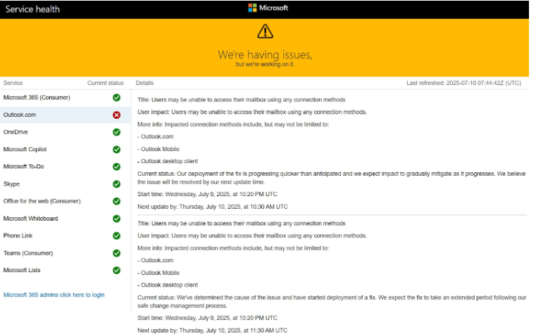 Outlook and Hotmail are down worldwide…users can’t log in or access emails. Microsoft says a fix is being rolled out, but no ETA yet. Stay tuned for updates.