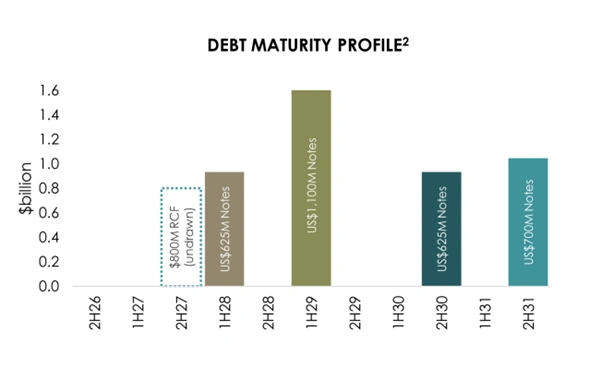 - US$700M at 7.000%, maturing 1 April 2031 (new issuance, replaced the US$700M May 2027 notes)