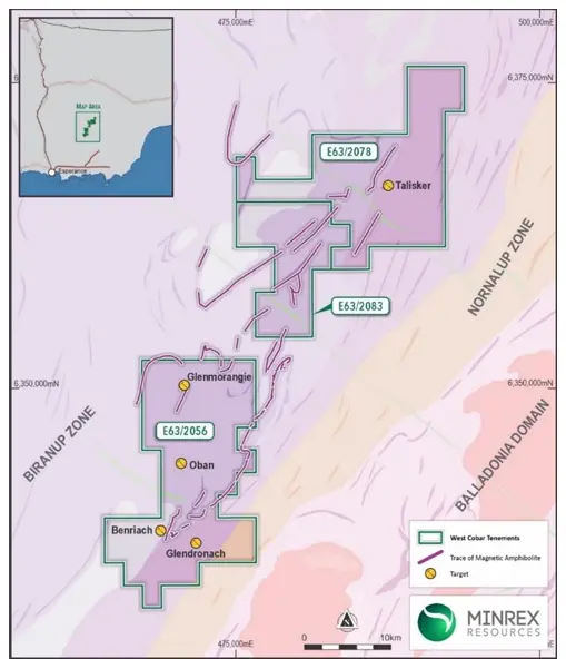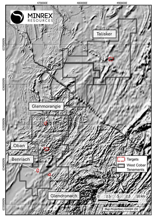 MinRex’s flagship Fraser Range Copper-Gold Project, located approximately 120km north-east of Esperance in Western Australia, saw significant activity during the quarter. The project forms part of a strategic farm-in agreement with West Cobar Metals Limited (ASX: WC1), where MinRex can earn a 50% interest. The geological setting of the Fraser Range is considered analogous to major mineralised systems such as the Nova-Bollinger nickel-copper deposit and IOCG targets of the Gawler Craton.