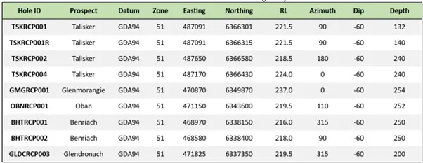 Figure 3: Table summarising the drill hole collar details from the Fraser Range Project, including hole locations, depths, and target prospects such as Talisker, Glenmorangie, Oban, Benriach, and Glendronach.