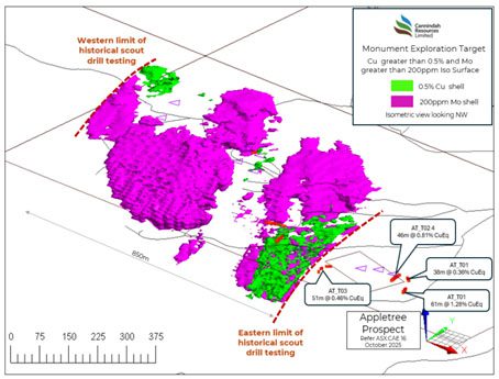 Figure 3: Northwest isometric view shows coinciding high-grade Cu (>0.5%) and Mo (>200 ppm) isosurfaces at Monument Target (Southern Zone), with Appletree–Dunno alignment and NW area pending investigation.