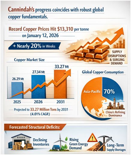 Cannindah’s progress coincides with robust global copper fundamentals, marked by record prices that hit $13,310 per tonne on January 12, 2026, up nearly 20% in just weeks amid supply disruptions and surging demand. The market size reaches 27.34 million tons in 2026 (from 26.29 million in 2025). It is projected to grow to 33.27 million tons by 2031 at a 4.01% CAGR, with Asia-Pacific accounting for 70% and China’s refining dominance leading the region. Forecasts highlight structural deficits: ICSG at 150,000 tons of refined copper in 2026, Morgan Stanley at 590,000 tons, due to mine growth slowing to 0.9-2.3% from declining grades (below 0.7%) and permitting delays.​