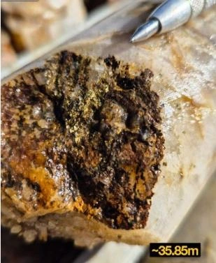 Visible gold was confirmed at 31.4m, 35.4m, 35.85m, 36.1m, and 36.45m. Assays are pending for this hole.