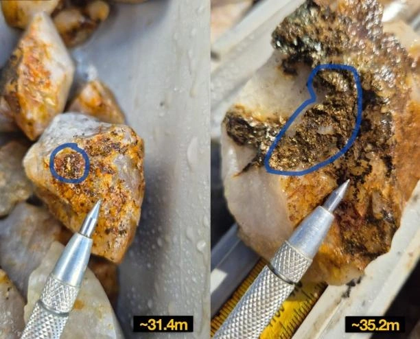Visible gold in quartz veins at 31.4m (left) and 35.2m (right) in 25MPDD001
