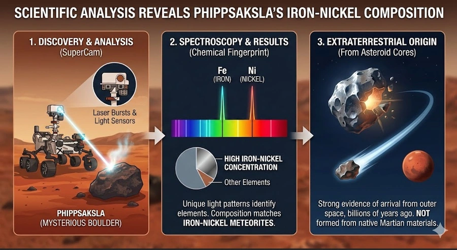 Perseverance deployed its SuperCam instrument to analyse the mysterious boulder. SuperCam fires tiny laser bursts at rock surfaces. The instrument then reads the light bouncing back to reveal chemical fingerprints. Scientists use spectroscopy to identify elements from their unique light patterns. Results showed an unusually high concentration of iron and nickel. This combination matches iron-nickel meteorites perfectly. Such meteorites originated from asteroid cores billions of years ago.