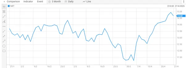 NXT shares have recovered sharply from their 2026 low. The stock hit an annual low of A$11.26 on 2 April 2026 and has since rebounded 27%. The 52-week high stands at A$18.22 and the 52-week low at A$10.47.
