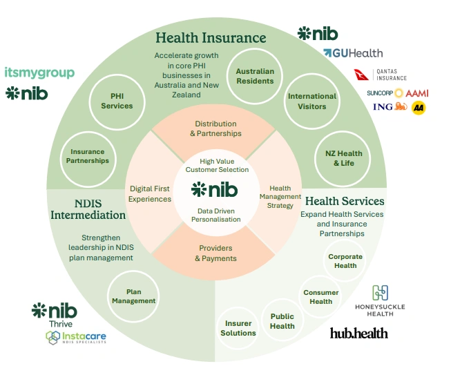 Figure 1: Overview of nib Group’s diversified ecosystem spanning core private health insurance, NDIS plan management, and digital health services.