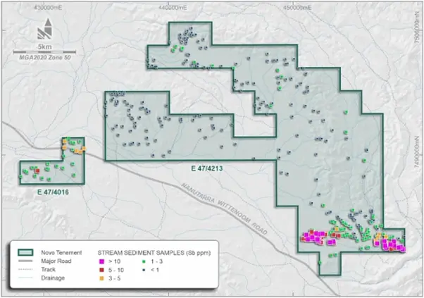 Stream sediment sampling results across Novo’s Wyloo tenements highlight antimony anomalies at the Wyloo Southwest prospect. [Novo Resources]