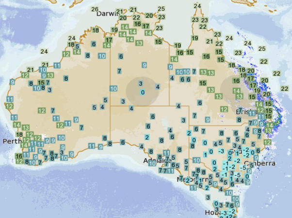 Brisbane faces a rainy day with a maximum of 17°C. Adelaide is expected to reach 15°C under mostly sunny skies. Canberra will peak at 13°C following a cold morning. Hobart is forecast to reach 12°C with similarly cool conditions.