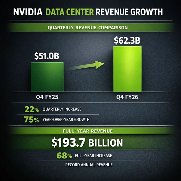 For the quarter ended 25th January 2026, NVIDIA reported record quarterly Data Center revenue of USD 62.3 billion, up 22% from Q3 and up 75% from a year ago. Full-year Data Center revenue reached a record USD 193.7 billion.