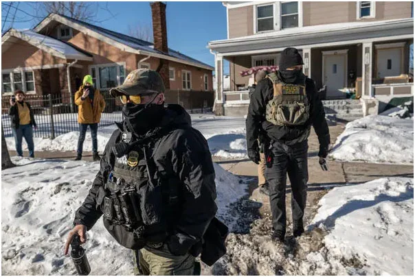Security Officers take the suspect away following the Minnesota town hall chaos. [The New York Times]