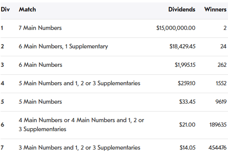Division three winners numbered 262 across Australia in this draw. Each of these successful players took home $1,995.15 for matching six winning numbers without the supplementary. The combined prize pool for division two and division three winners totalled substantial amounts despite the lower individual payouts.