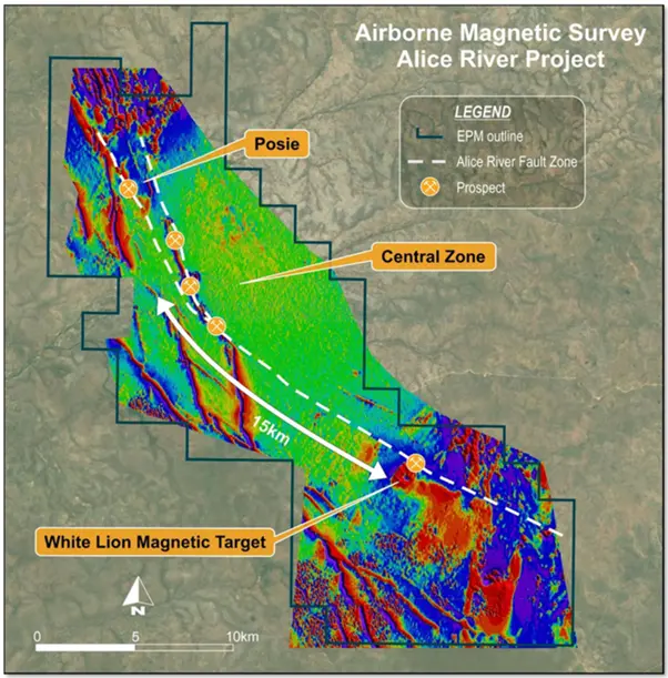 The geological setting is ideal. The White Lion target sits only 500 metres south of the major NW-SE trending Alice River Fault Zone, where surface mapping has exposed quartz breccias over 250 metres. Historic shallow drilling in the 1980s yielded anomalous gold, but the central magnetic anomaly remains entirely undrilled.