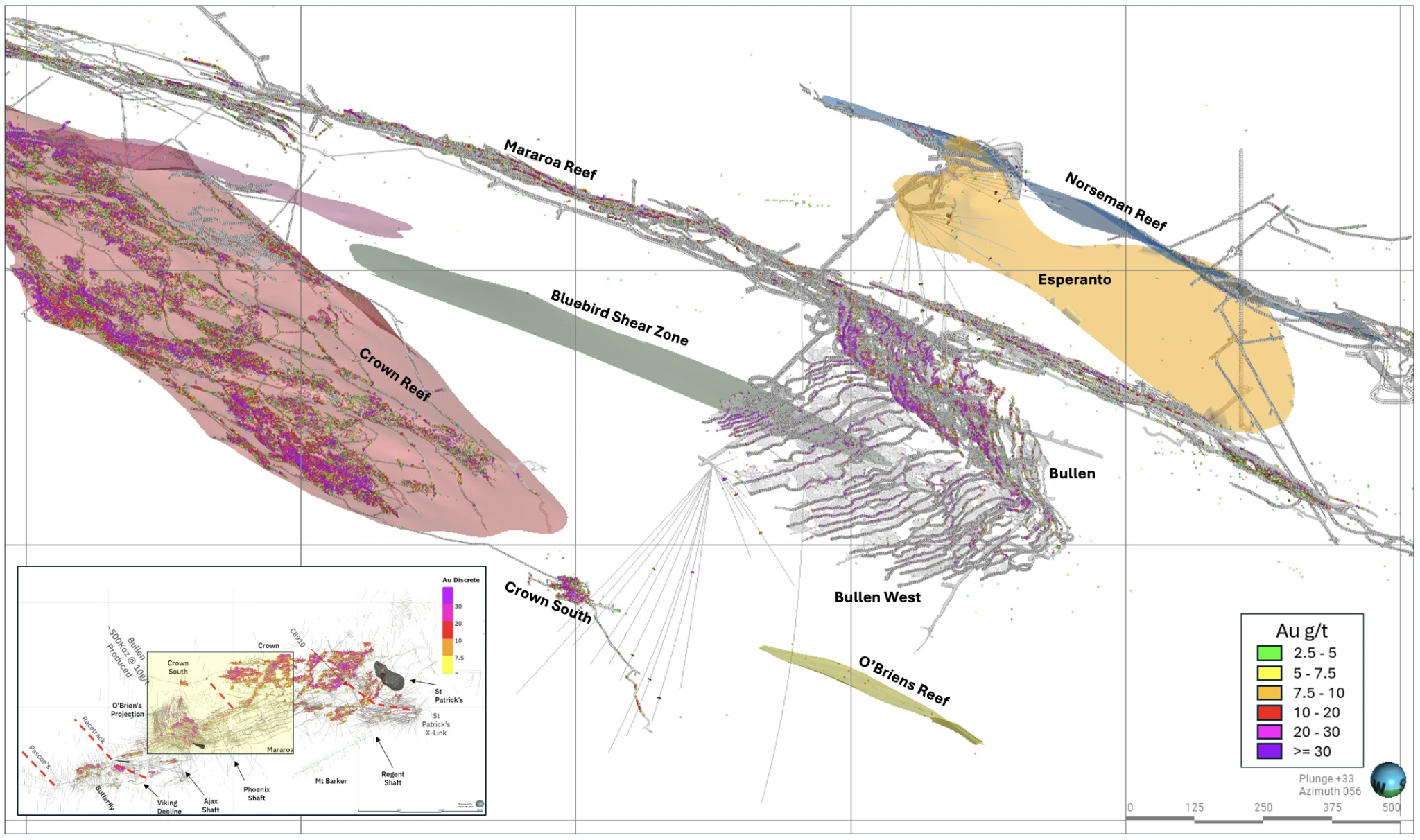 - Crown South Reef, yielding multiple intercepts up to 71.14 g/t Au;