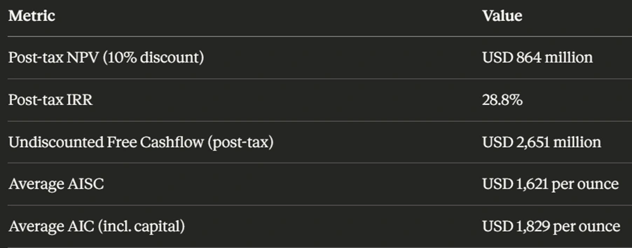 At a higher gold price of USD 4,000 per ounce, the post-tax NPV climbs to USD 1.877 billion with an IRR of 47.8%. If gold reaches USD 5,000 per ounce, the NPV pushes further to USD 2.889 billion.