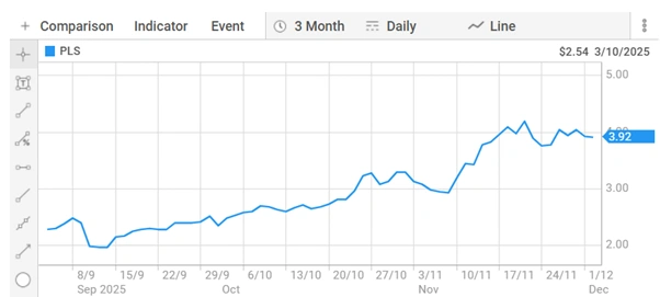 PLS shares closed at AUD 3.915 on 2 December 2025. The stock trades within a 52-week range of AUD 1.070 to AUD 4.260. Market capitalisation stands at AUD 12.62 billion.