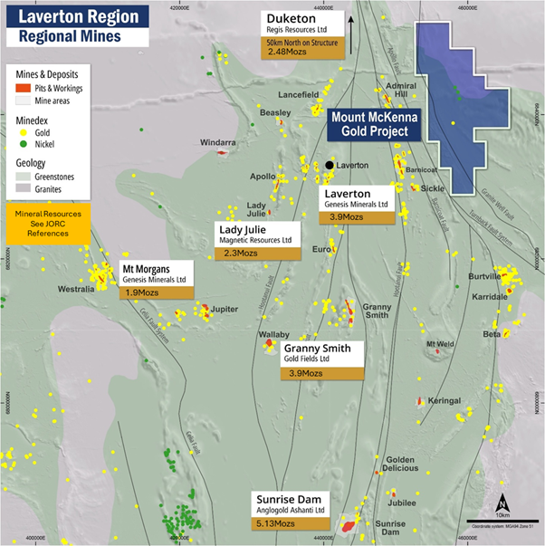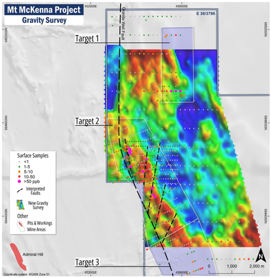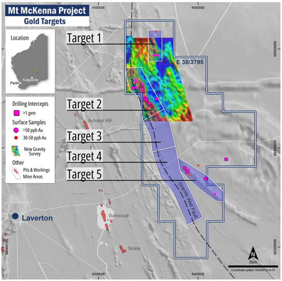 Figure 2: Mt McKenna Project location showing the regional Granite Well fault and delineated target zones.
