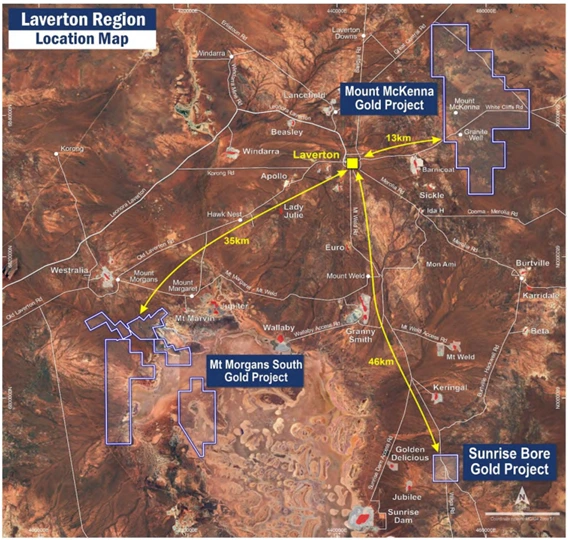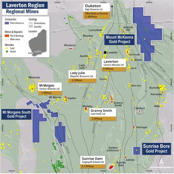Figure 1: Project location map showing Mt Morgans South, Mt McKenna, and Sunrise Bore. [Platina Resources]