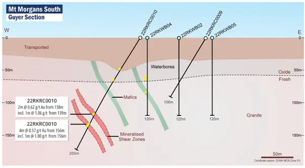 Figure 6: Section displaying mineralisation and interpreted geology from hole 22RKRC0010 in the Project West (Ghan Well–Acacia Well) area, covering ±250 m. No drilling exists 750 m north or 480 m south, with Iceni Gold’s Guyer prospect beginning just outside the southern boundary. [Platina Resources]