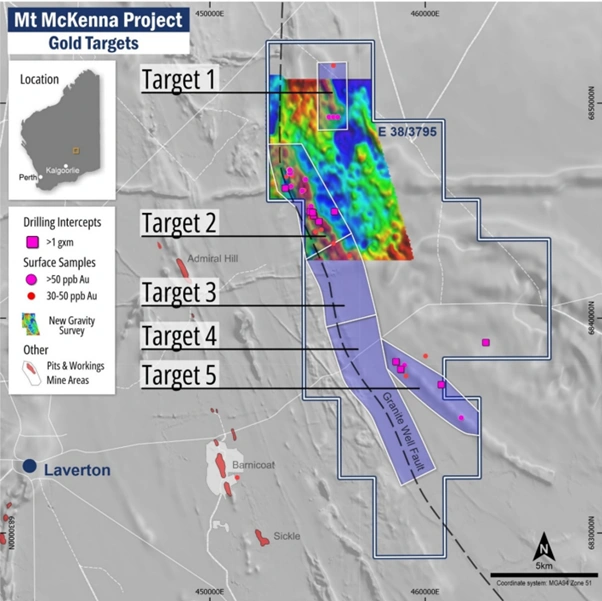 Figure 2: Mt McKenna Gold Project location near Laverton with interpreted regional Granite Well fault and delineated target zones. [Platina Resources]