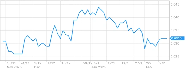 Platina Resources (ASX: PGM) is trading around $0.032 per share as of mid-February 2026, within a 52-week range of $0.018 to $0.045. The Company’s market capitalisation sits at approximately $20.63 million.