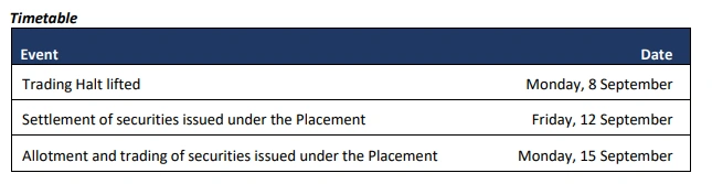 Placement shares will settle on 12 September, with trading starting 15 September 2025.
