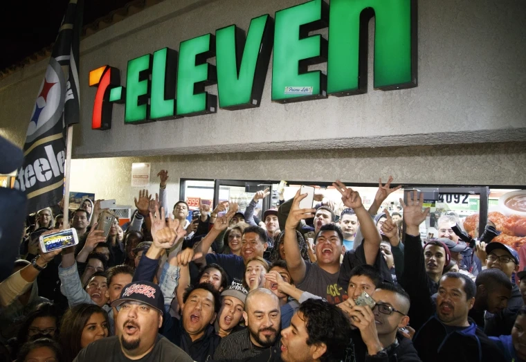 Crowd celebrating a $1.6 billion Powerball win outside 7-Eleven