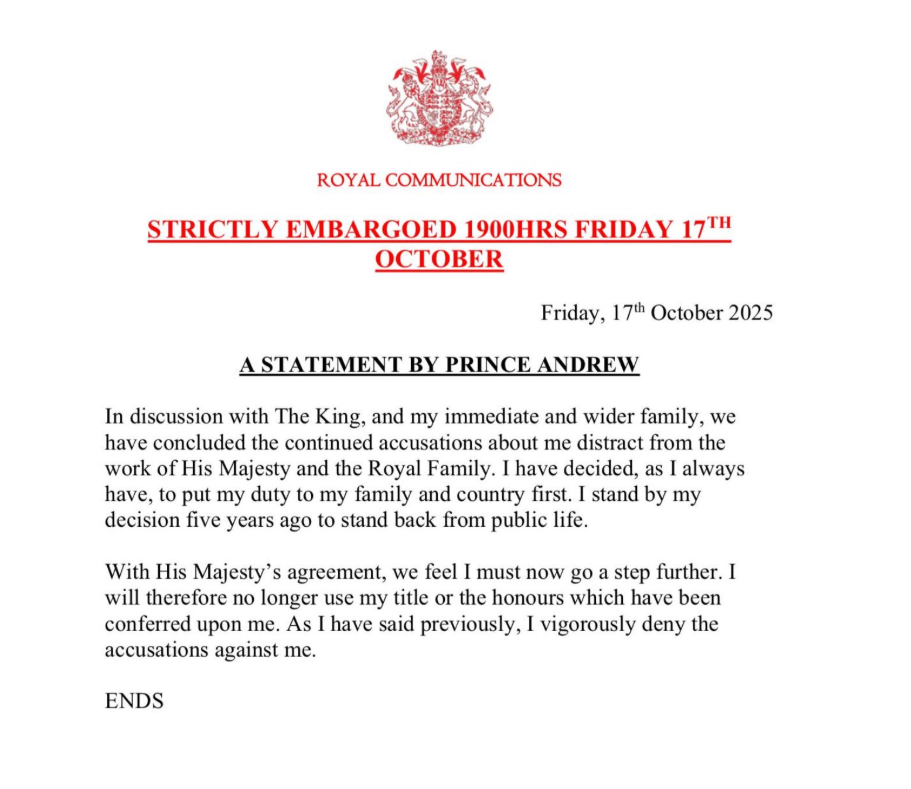 On October 17, 2025, Prince Andrew issued a statement confirming his voluntary surrender of the Duke of York title and other honours. He said this decision came “in discussion with the King, and my immediate and wider family,” who agreed the ongoing accusations “distract from the work of His Majesty and the Royal Family.” He affirmed his duty to family and country as his priority and reaffirmed his 2019 decision to step back from public life. The prince emphasised, “I have consistently denied the allegations made against me.”