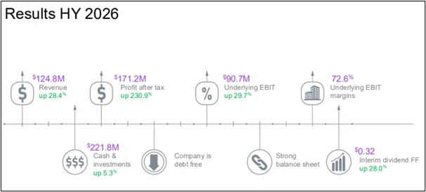 Figure 2: Pro Medicus HY26 financial highlights including revenue, profit, margins, cash position and interim dividend [Source: Pro Medicus]