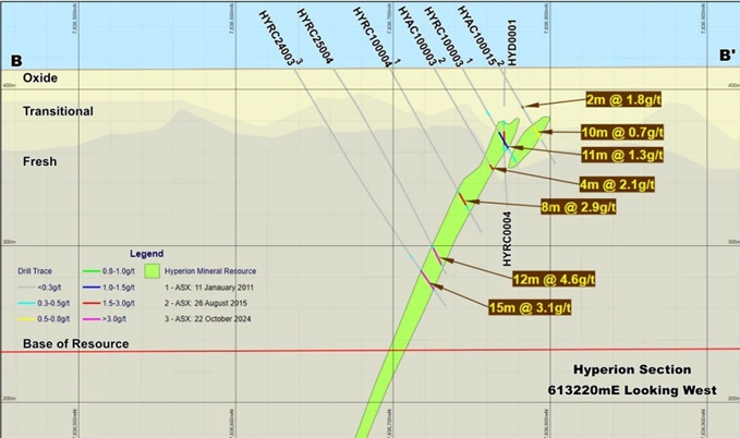 Figure 3: Hyperion mineralised section at 613220mE, looking west, highlighting gold intercepts and resource continuity [Prodigy Gold]