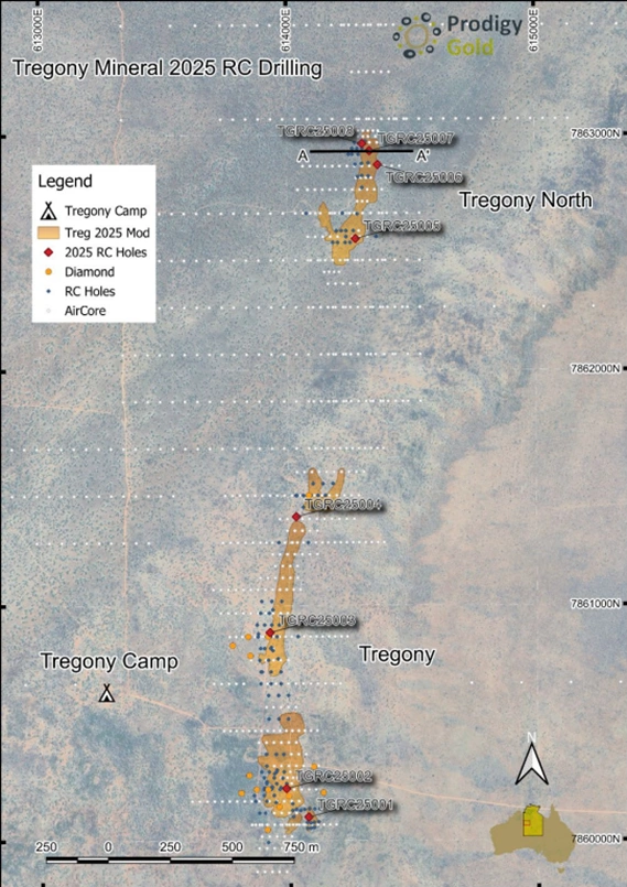 Figure 5: Plan view of 2025 RC drilling at the Tregony Deposit, showing drill hole locations and mineralised trends at Tregony North [Prodigy Gold]